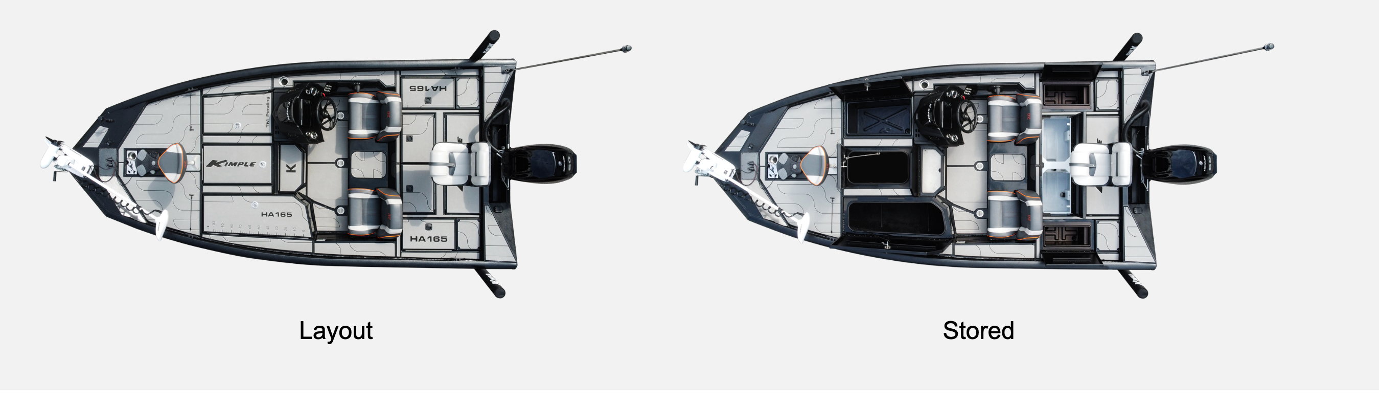 Le KIMPLE HA 165 inaugure la nouvelle génération de bass boats KIMPLE. Conçu comme un bateau très large et particulièrement stable, il se distingue par son positionnement haut de gamme et son niveau d’équipement de série exceptionnel. Cette version accepte des moteurs thermiques puissants, jusqu’à 90 CV, ce qui en fait une plateforme performante aussi bien pour la pêche sportive que pour les sorties nautiques dynamiques.
